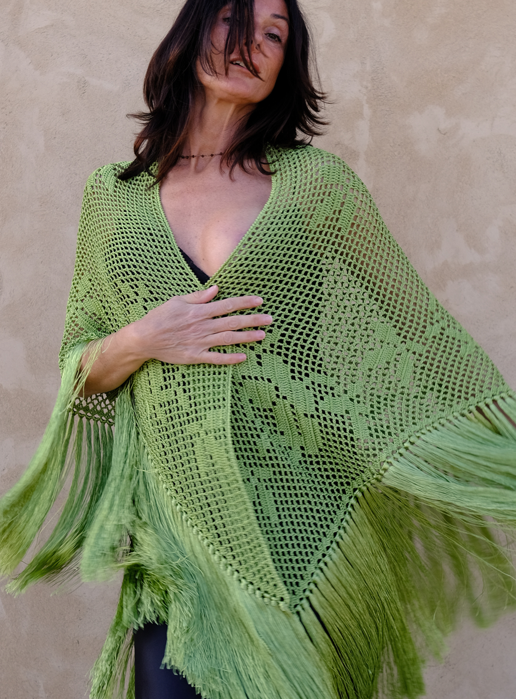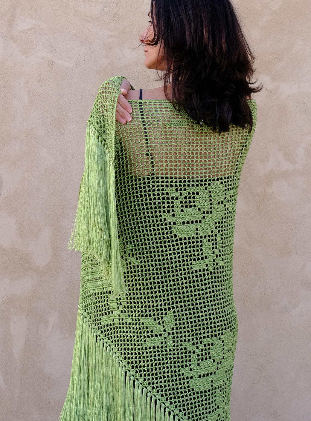 Il disegno realizzato a mano si ritrova nei minimi dettagli sul davanti come sul retro; trasformando il capo, impreziosito dalla seta, in un capo versatile da indossare in abbinamento con abiti ricercati. Uno Scialle, questo, che ammicca alle più fresche sere d’estate e ai primi timidi giorni di primavera. Il setone inserito nelle frange è stato ricercato volutamente per rievocare la frangia utilizzata in passato nella tradizione antica dello Scialle Siciliano.